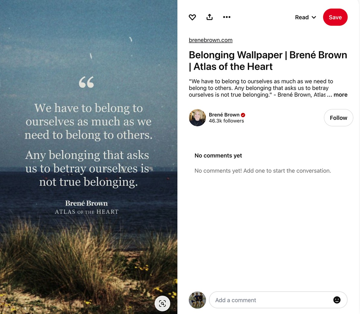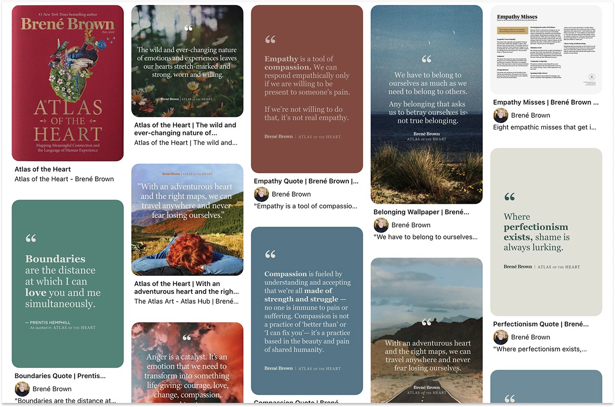 As a place of discovery, inspiration, and expression on the internet, Pinterest is a space to meet people where they are at through beautifully crafted assets. From curating quotes and content, using imagery and design to make it compelling, and embracing Pinterest best practices, we created suites of quote cards, resources, and phone backgrounds for Atlas of the Heart and the ABK Edit.