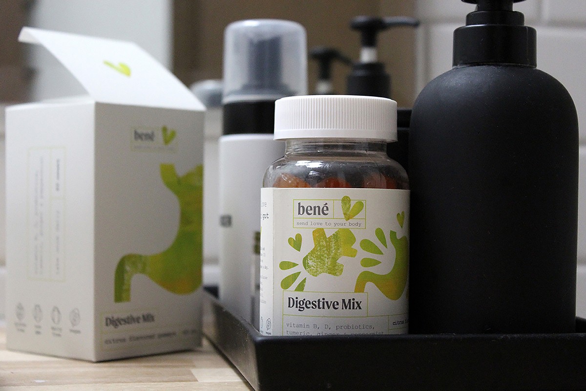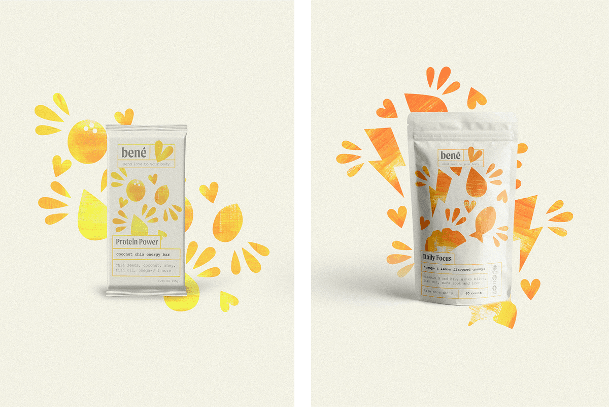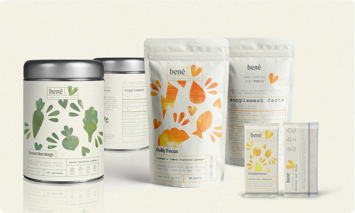 A hypothetical house brand for Target, Bené makes shopping for vitamins and supplements simple and fun. Taking inspiration from the yoga practice of sending love and attention to the parts of our bodies and lives that need the most care, supplements are categorized by the area of support. Warm and hand painted, these supplements look beautiful on countertops and add joy to routines of self-care.